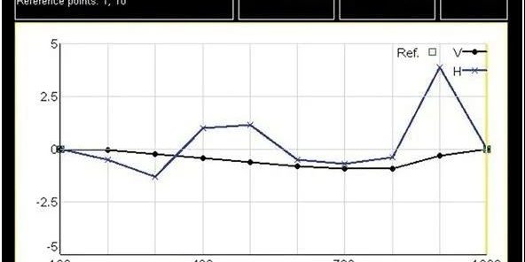 直线度测量将激光束作为参考,可以同时测量水平和垂直方向,将探测器放在需要测量的位置并记录数值,测量后选择两个合适的测量点作为基准线,其他测量点相对于基准线的数值就出来了,测量中可以增加或删除测量点。