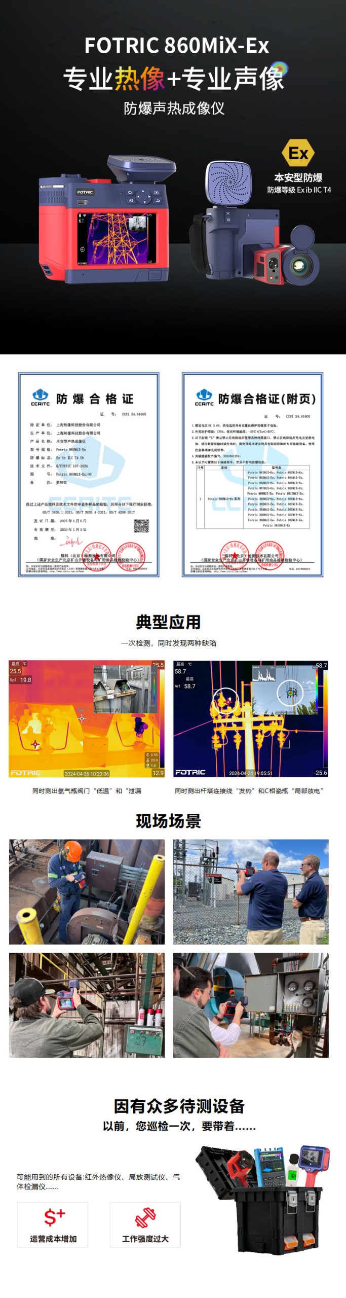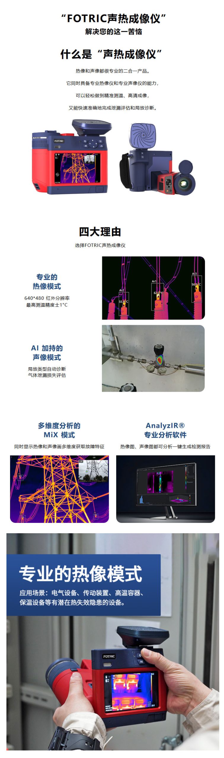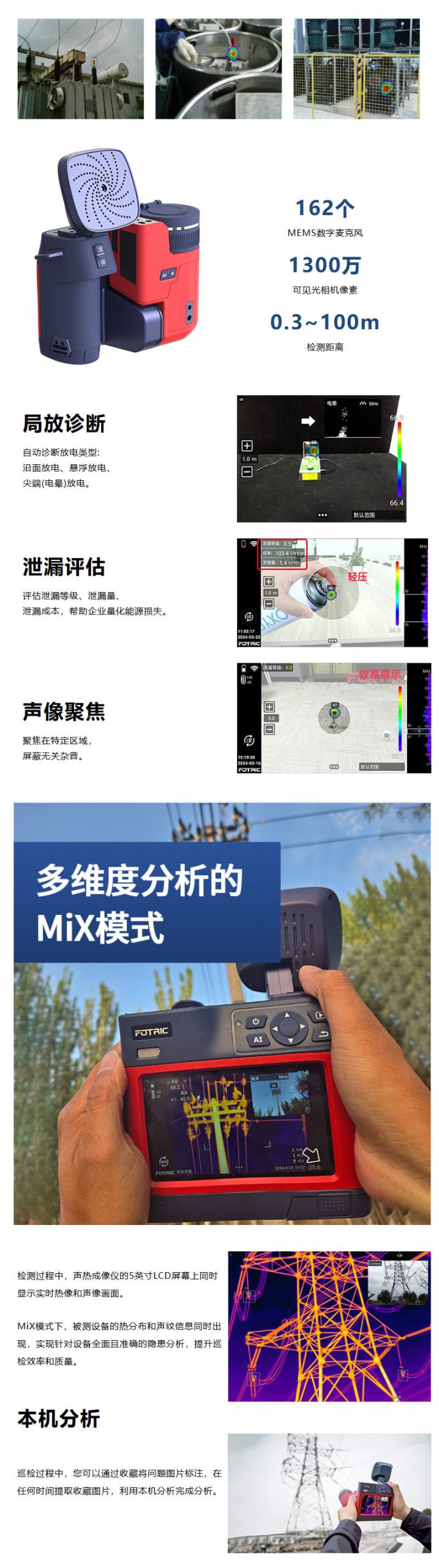 热像和声像都很专业的二合一产品。它同时具备专业热像仪和专业声像仪的能力,可以轻松做到精准测温、高清成像,又能快速准确地完成泄漏评估和局放诊断。