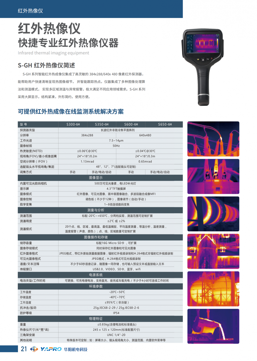 S300/S600是一款智能手持式热成像仪">红外热成像仪,集成高灵 敏的384╳288/640╳480像素红外探测器,能帮助用户快速清 晰呈现热图像细节,并智能跟踪热点。仪器集成了多种图像处 理算法和测温模式,实现多区域测温与异常报警,极大满足不 同应用领域需求。S300/S600采用大屏显示,结构紧凑,外 形简约,使用方便。